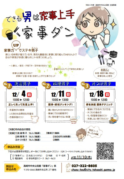 3回に分けて行われるようで、洗濯・料理・片付けを学べます。